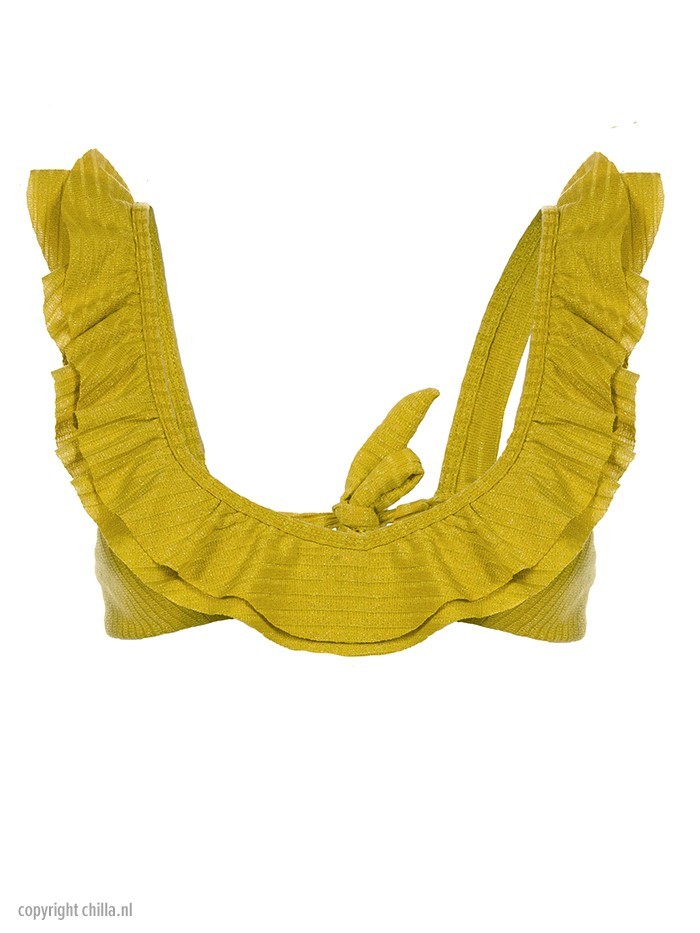 Unique mustard yellow top with 2 layers of ruffles made out of a luxury ribbed lurex fabric. The bikini bottom is in a lovely foliage print and the leafs are embroidered by hand with colorful yarns. Scrunch bikini bottom with Brazilian (half-) back coverage. April Swimwear 2021 Back to Nature Collection.