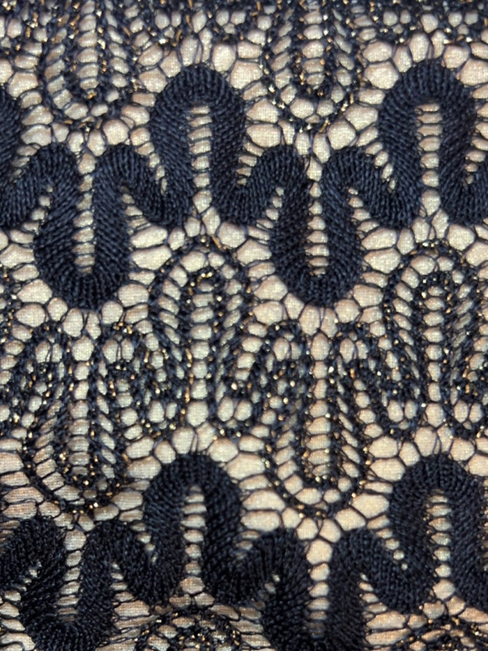 Halter bikini with black crochet lace layer in wavy pattern over a gold glittering fabric.Double straps under the bust and wider straps to tie in the neck. Also suitable for larger cup sizes (D/DD). The straps are made of black lycra. Seamless bikini bottoms with a black crochet lace layer in wavy pattern on the front over a gold glittering fabric. The bottom is made of black lycra at the back and has a normal, full coverage at the back. The black lace fabric has gold metallic details.
