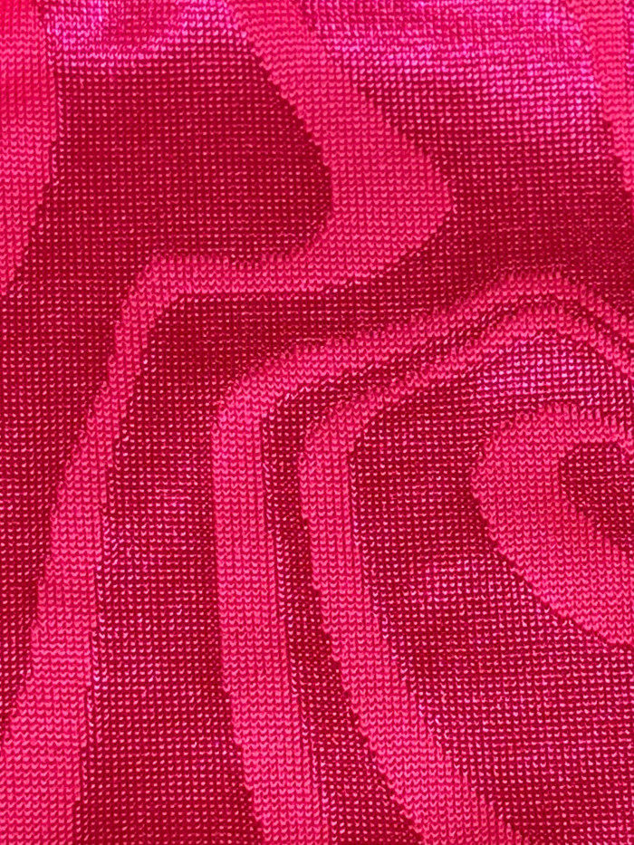 Luxurious seamless bikini in a vintage fuchsia-pink Jacquard print. Triangle top with gold-coated rings and small cut-outs at the top. The neck ties are embellished with gold-plated amulets with Luli Fama Signature Rings. High-leg Brazilian back bikini bottom embellished with double gold-coated rings.