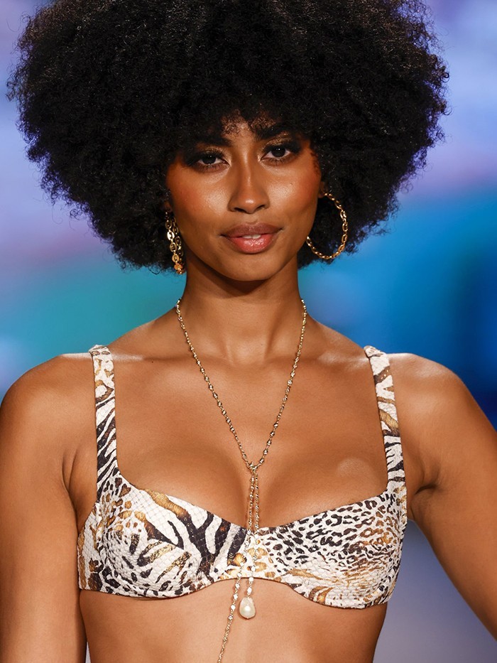 Gorgeous balconette style top in a textured fabric in copper and cream animal print (zebra and leopard) and metallic luxe threading. Supportive underwire and wide adjustable shoulder straps. Ties on the back.