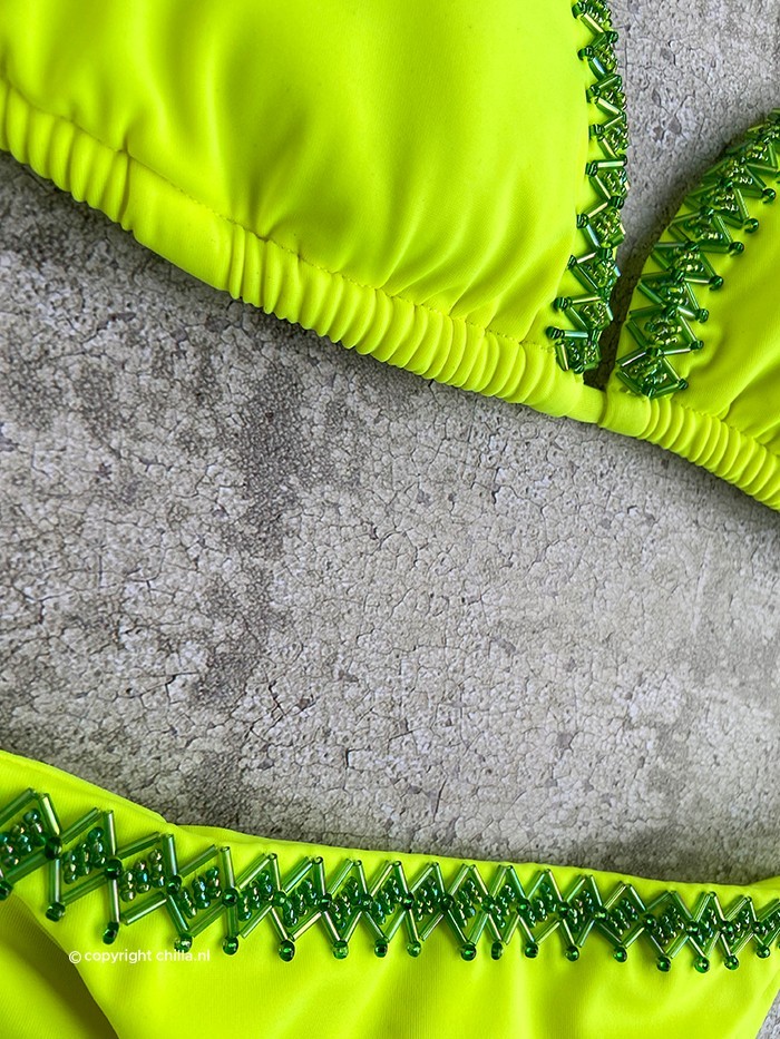 Neon green bikini. Brightly colored and perfect for hot summer days! Both the top and the bottoms are embellished by hand along the edge with green beads in a diamond pattern. Latin fit bikini bottom with a gathered seam at the back (scrunch bottom). The straps to tie are decorated with green beads.