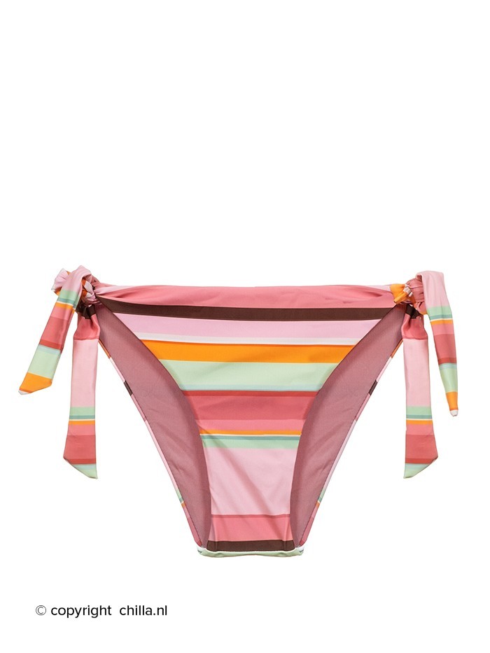 Brazilian bottom in a nice striped print in the colors pastel pink, old pink, green, off-white and orange. The bikini bottom can be tied at the hips and has a half coverage at the back.