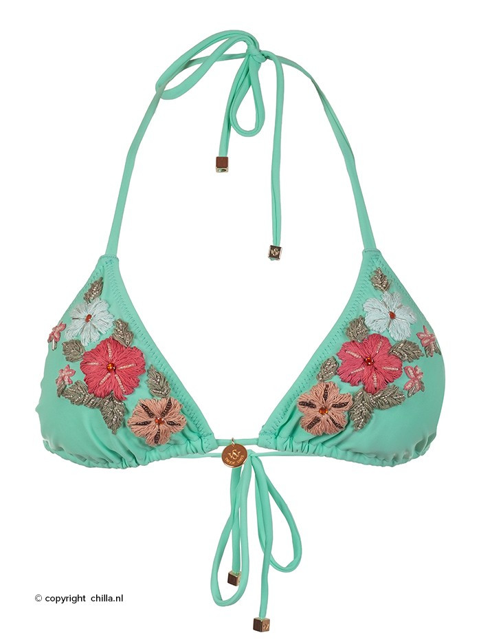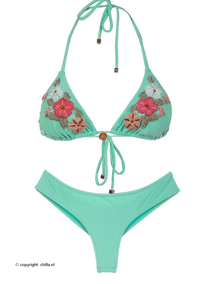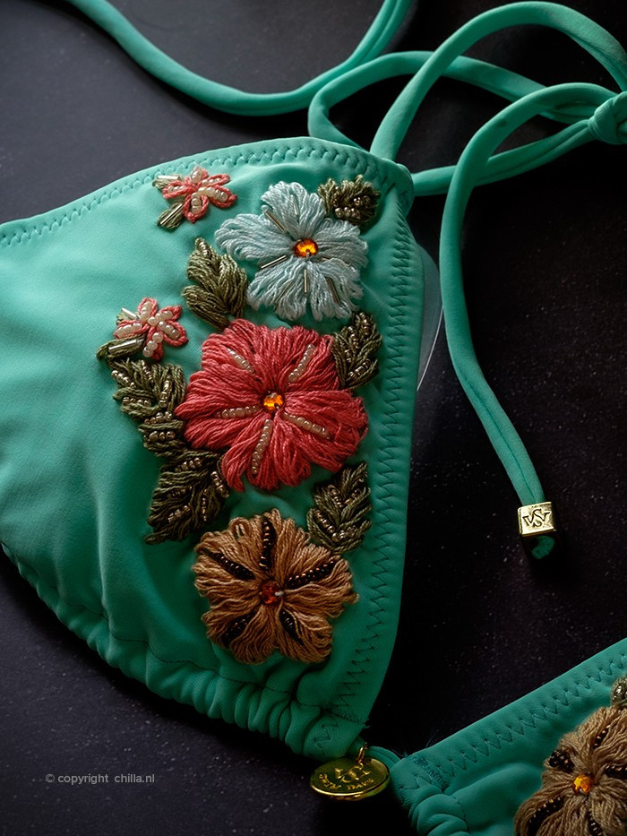 Lovely white ring triangle bikini. The top is embroidered by hand with pink flowers and green leafs. Along the edges decorative pink stitching. Latin fit tie-side bikini bottom. Straps embellished with beads. Comes with a bikini bag with Swim Days logo.