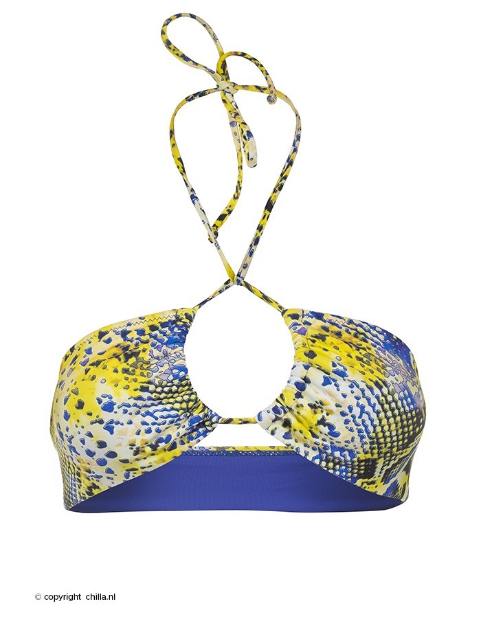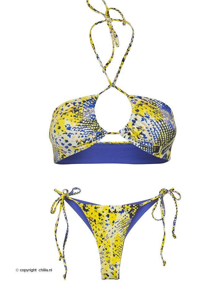 Cute bandeau top that can be tied at the front (to wear strapless) and at the neck. The bottom can be tied at the hips with straps. Tie-side bikini bottom with Brazilian back: half coverage at the back. The bikini comes in a snake print in the colors yellow, electric blue, black and white.