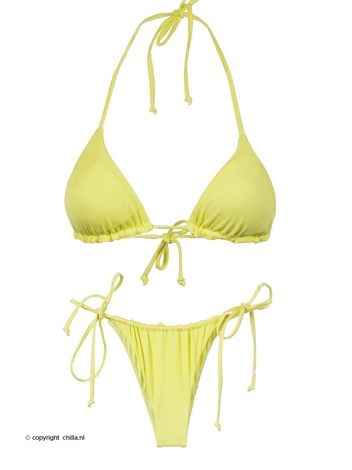Bikini in a beautiful (soft) yellow color. The fabric has a luxurious vertical rib texture. The top can be tied in the neck and on the back. Removable padding. High-cut bottoms with a half coverage at the back. Mini bikini bottoms with half coverage at the back. The bottom can be slid narrower / wider at the front.