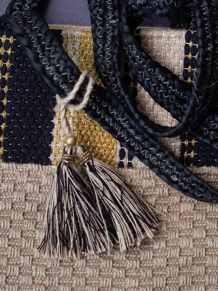 Formaat: b 49 x d 17 x h 37 cm. Kleur: naturel met zwart en goud. Materiaal: 50% jute, 40% polyester, 5% katoen en 5% metallic. Artikelcode: IC23-B07