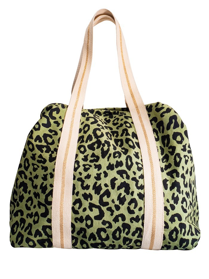 Deze ultralichte en extra ruime strandtas van puur katoen heeft een dierenprintpatroon, goudkleurige verstevigde handvatten, een binnenzak met ritssluiting en een dubbele drukknoopsluiting. Let's get wild!
