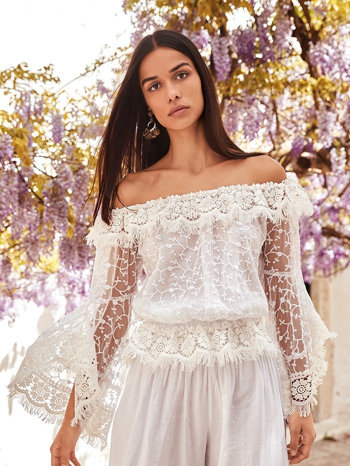 Exclusieve off-shoulder top in gebroken wit. Langs de bovenrand van de hals en aan de onderkant van de mouwen versierd met verfijnd gebloemd guipure kant. De mouwen zijn transparant geborduurd met bloemetjes. Het lijfje is gevoerd. Super chique en heerlijk luchtig om te dragen!