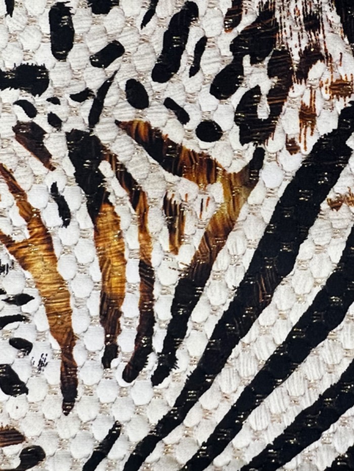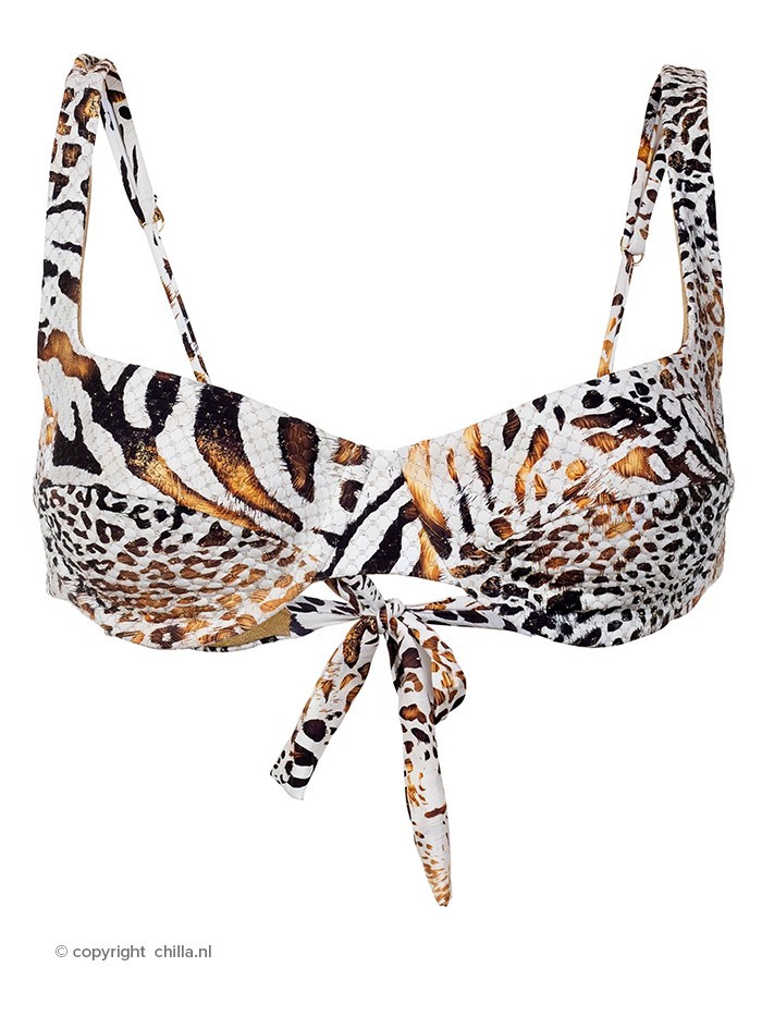 Balconette stijl topje uitgevoerd in een stof met textuur in een fraaie koper met crèmekleurige dierenprint (luipaard gecombineerd met zebra) verweven met metallic garen voor een luxe uitstraling. Brede ondersteunende bandjes die verstelbaar zijn. De top heeft beugels voor extra support en lift en is op de rug te strikken.