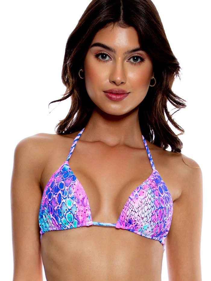 Naadloze triangeltop versierd met kleine glinsterende kristallen in een uitbundige kobaltblauwe,roze, fuchsia en turquoise slangenprint. De nekkoordjes om te strikken zijn versierd met vergulde amuletjes met het Luli Fama logo.