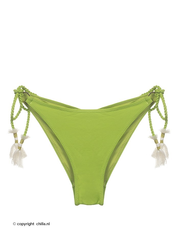 Prachtige pistache groene bikini versierd met vergulde ringetjes. De nek-en rugbandjes zijn handgeknoopte macramé koordjes. Het broekje is op de heupen te strikken en geeft een Latin bedekking aan de achterzijde en heeft een scrunch (gerimpelde naad) om je billen beter uit te laten komen. De macramé koordjes aan het broekje zijn versierd witte franjekwastjes en witte en groene glansgarens. Super mooie bikini!