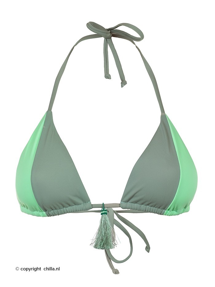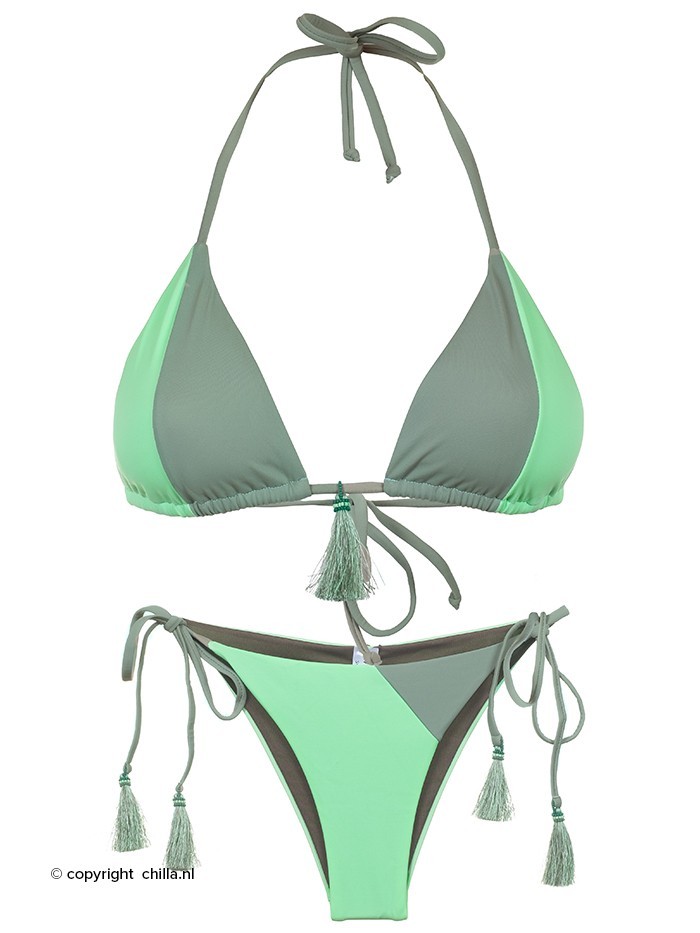 Triangelbikini van Mystical Swimwear uitgevoerd in een trendy matte stof in 2 kleuren groen (mintgroen en zacht mosgroen). Het topje is in het midden versierd met een kwastje gemaakt van kraaltjes en franjes. Het broekje is op de heupen te strikken met koordjes versierd met kwastjes met kraaltjes. Latin fit broekje met een halve bedekking aan de achterzijde. Het broekje heeft een scrunch achterzijde met gerimpelde naad.
