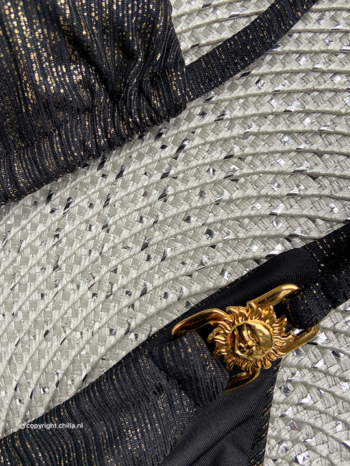 Sparkle en shine op het strand in deze fantastische zwarte bikini met een geribbelde stof en gouden glans Zowel het topje als het broekje zijn versierd met vergulde schakels met een zon design. Brazilian scrunch back broekje: met halve bedekking aan de achterkant en met een gerimpelde naad om je billen beter uit te laten komen. Bestseller!