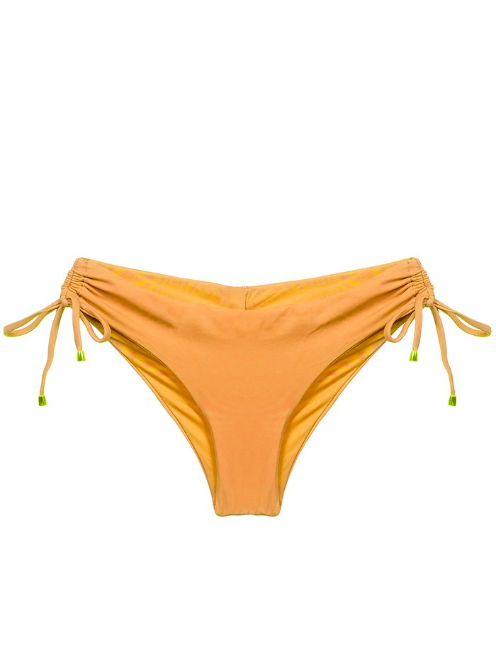Bikini broekje in een prachtige amberkleur: Amber is een oranje-gele kleur die haar naam te danken heeft aan de kleur van barnsteen. Het cheeky broekje is aan de zijkanten aan te snoeren met koordjes versierd met vergulde kralen. Het broekje heeft een gerimpelde naad aan de achterzijde voor een betere pasvorm.