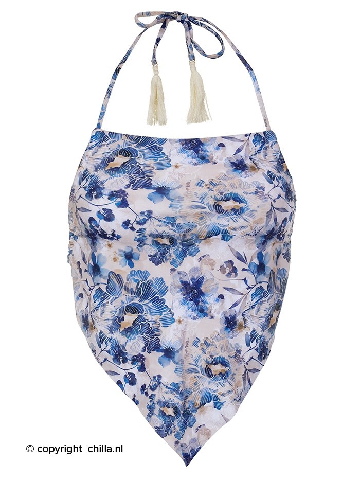 Super trendy! De halter bandana top, ook wel hanky top genoemd. De top is in de nek en op de rug te strikken en valt in de voorzijde in een punt naar beneden. De nekbandjes zijn versierd met witte kwastjes. De top is uitgevoerd in een fraaie bloemenprint in de kleuren wit, goudbeige, hemelsblauw en kobaltbauw.