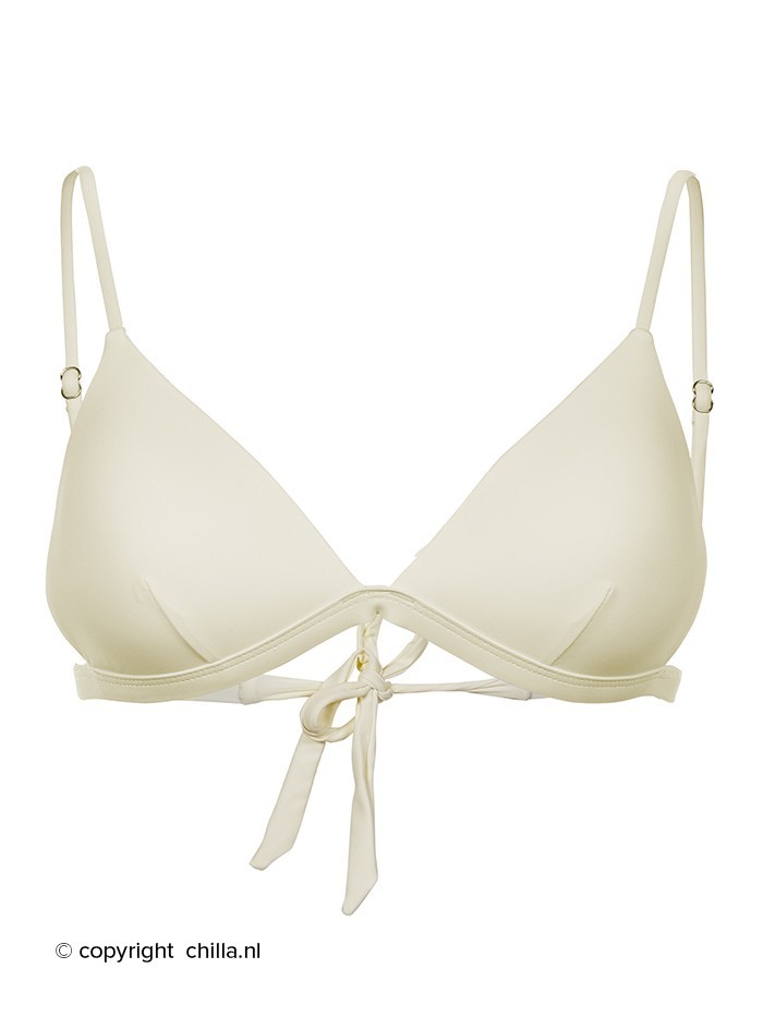 Over the shoulder (OTS) top, oftewel de bandjes lopen over de schouder en zijn verstelbaar. Vaste triangel top waarbij de cups niet schuifbaar zijn. De cups zijn voorgevormd met coupenaadjes voor de juiste pasvorm. De bandjes kun je op de rug strikken. Kleur: gebroken wit