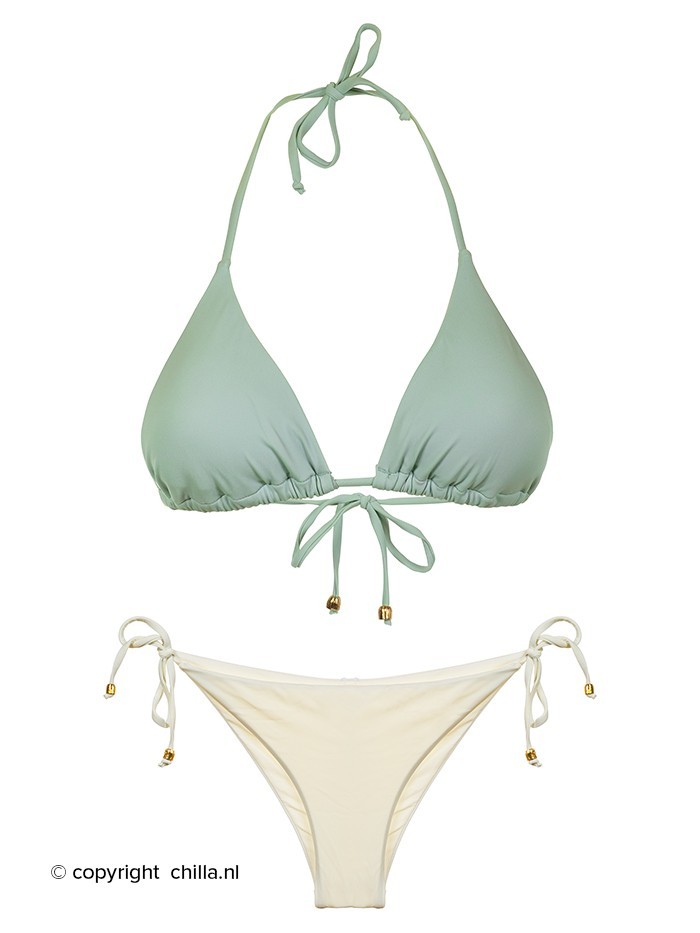 Triangeltop in pastel basil/groen. Het triangeltopje is in de nek en op de rug te strikken en heeft uitneembare vullingen. Gebroken wit tie-side Brazil broekje met een gerimpelde naad aan de achterzijde (scrunch) voor een betere pasvorm. Halve bedekking aan de achterkant.