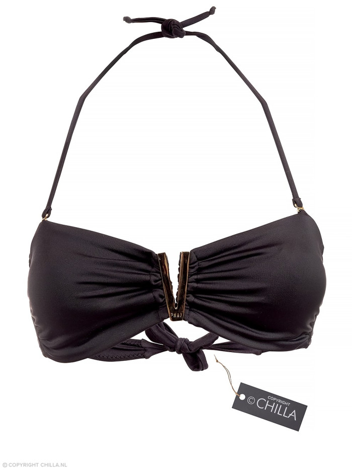 Zwarte bandeautop uit de Color-Mix collectie van Phax. Het bandeau topje is in het midden voorzien van een goudkleurig sieraad in de vorm van een V. Het topje is voorzien van een afneembaar nekbandje om de top ook strapless te kunnen dragen. Het topje is op de rug en in de nek te strikken.