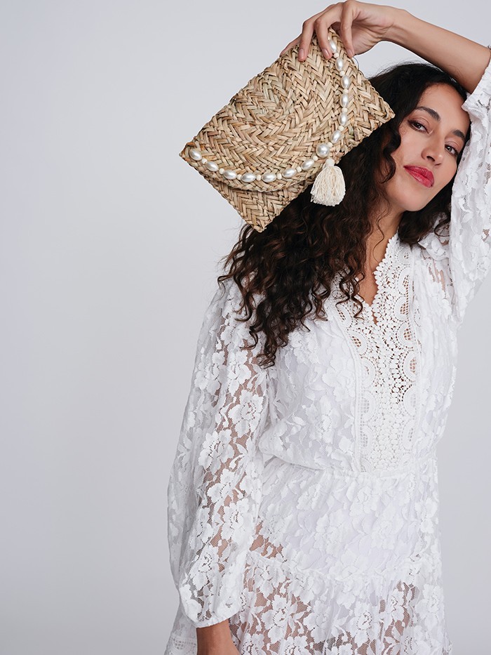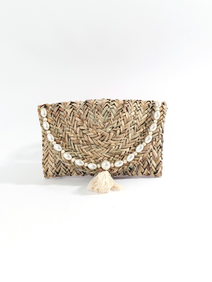 Formaat: 26 x 17 cm. Kleur: naturel met schelpen. Materiaal: 100% zeegras. Voering 100% polyester. Artikelcode: PRSAN050