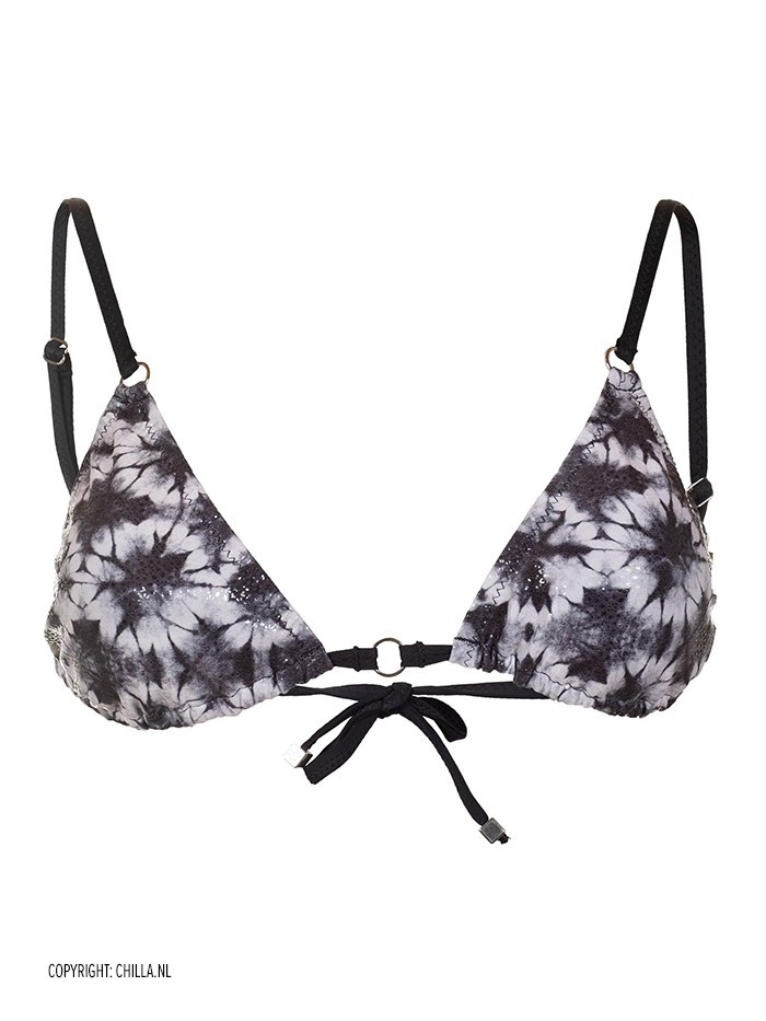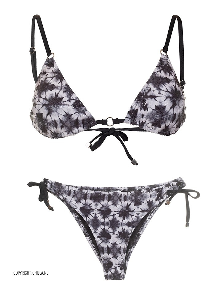 Leuke triangelbikini in een gebatikte print van bloemen in wit met zwart. De stof is glanzend, dus je kunt shinen op het strand! De top is versierd met ringetjes. Het bikinibroekje is op de heupen te strikken met zwart-wit gestreepte koordjes versierd met zilverkleurige kralen. Een bikini tasje met Swim Days logo wordt meegeleverd.