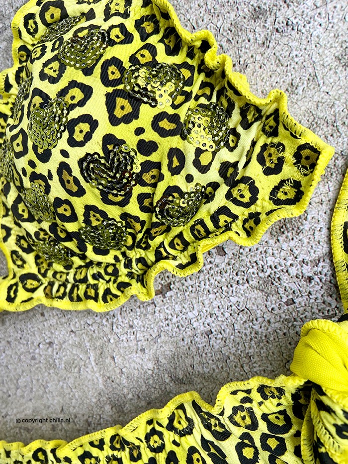 Bikini in een prachtige lime groene kleur met luipaardprint. De golvende randjes zijn voorzien van groen stiksel.Het topje is versierd met groene kralen en op de cups voorzien van groene paillettenhartjes. Het topje is in de nek en op de rug te strikken Uitneembare vullingen. Het broekje is op de heup te strikken en heeft een halve bedekking aan de achterzijde.